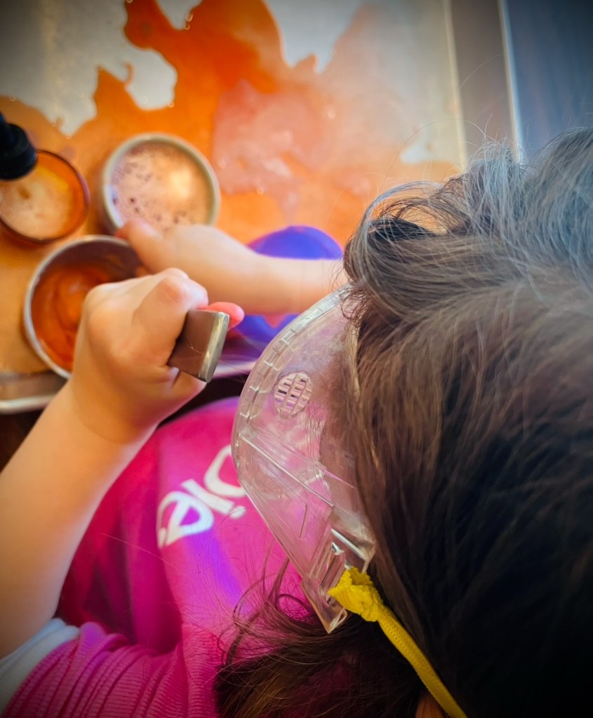 Then came the thumb wars—giggles and all—even the baby got involved. The fun turned to more science when our 3-year-old requested an experiment. I filled a cake pan with soap, vinegar, baking soda, and some red drink powder. She used a dropper to test different combinations and described what she heard, saw, and smelled.