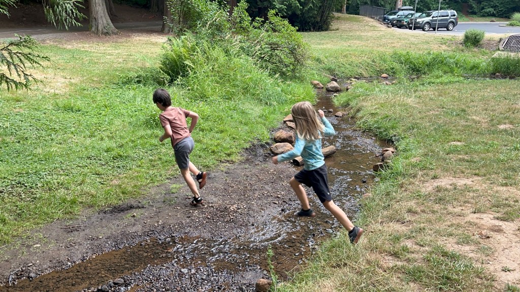 Our field trips always include spontaneous stops, and this trip was no exception. We found a hidden gem at Meinig Memorial Park in Sandy, Oregon—a fantasy forest playground with winding trails and a cool stream. It was meant to be a quick stretch-your-legs stop, but the kids could have stayed for hours. These unexpected pauses are often where the richest memories are made, discovering beauty in the small, unscheduled moments.