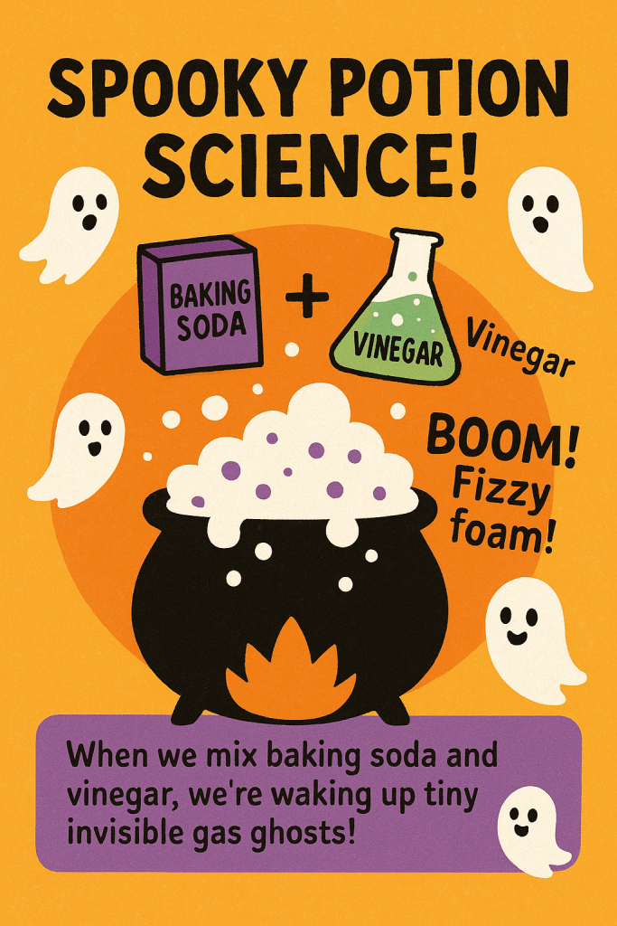 When we mix baking soda and vinegar, we’re waking up tiny invisible gas ghosts! 👻💨