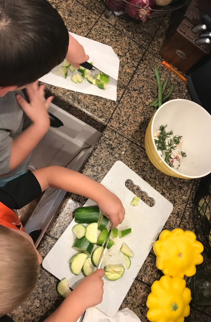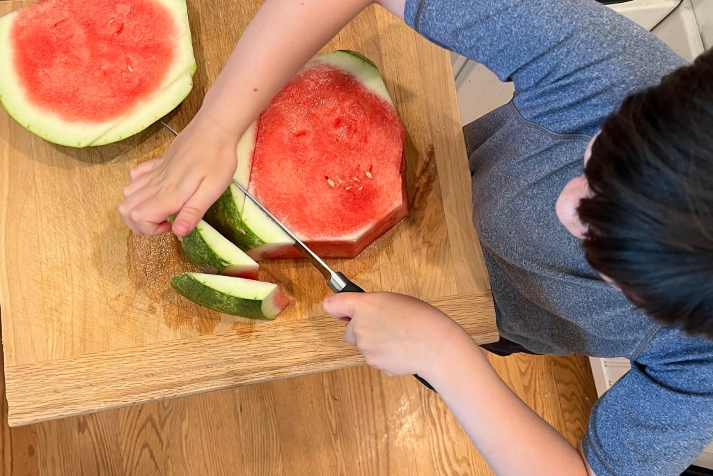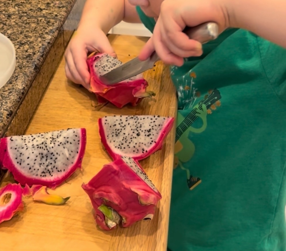 A cutting board, safety knife, and a request to “help” cut some veggies/fruits.