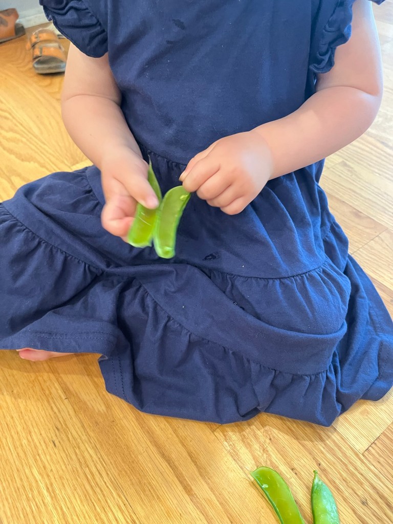 Try: “How can we get these peas out of the pod?” “Does it crunch loudly or softly?” “What does it smell like?”